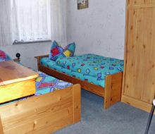 Der Schlafraum mit zwei Einzelbetten und einem Etagenbett bietet Platz für 4 Personen (max. 3 Erwachsene + 1 Kind). Die Einzelbetten lassen sich auch zusammenrücken.