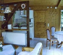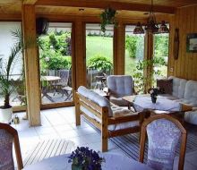 Der Wohnraum der Ferienwohnung trägt den Charakter eines Wintergartens. Viel Licht und eine angenehme Atmosphäre werden Sie hier empfangen. Die kleine Küchenzeile ist mit einem Kühlschrank, einem Elektroherd, einer Mikrowelle, einer Kaffeemaschine, einem Toaster und ausreichend Geschirr ausgestattet.